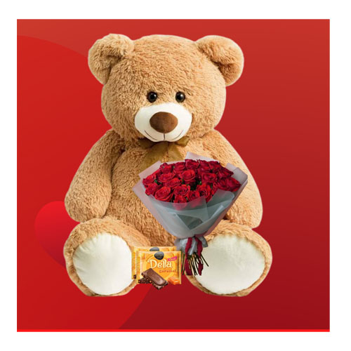 Complementing the teddy bear is a premium rose bouquet, carefully arranged to capture attention and emotion. Red roses symbolize deep love and admiration; therefore, each bloom quietly carries your message. As a result, the bouquet adds elegance, color, and romance to the entire presentation.