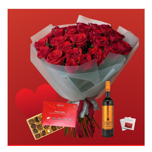 Premium Rose Bouquet, Rosso Nobile Wine, Boxed Chocolates & Card